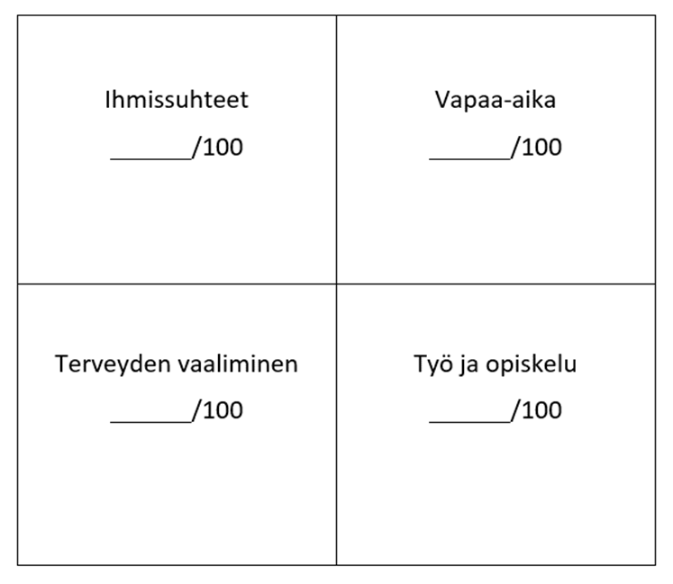 - Kirjaa miten sata pelimerkkiäsi jakautuvat tällä hetkellä eri elämänalueille. Käytä tähän alta löytyvää taulukkoa. Voit ladata ja tulostaa sen täytettäväksi tai voit piirtää sen itse.