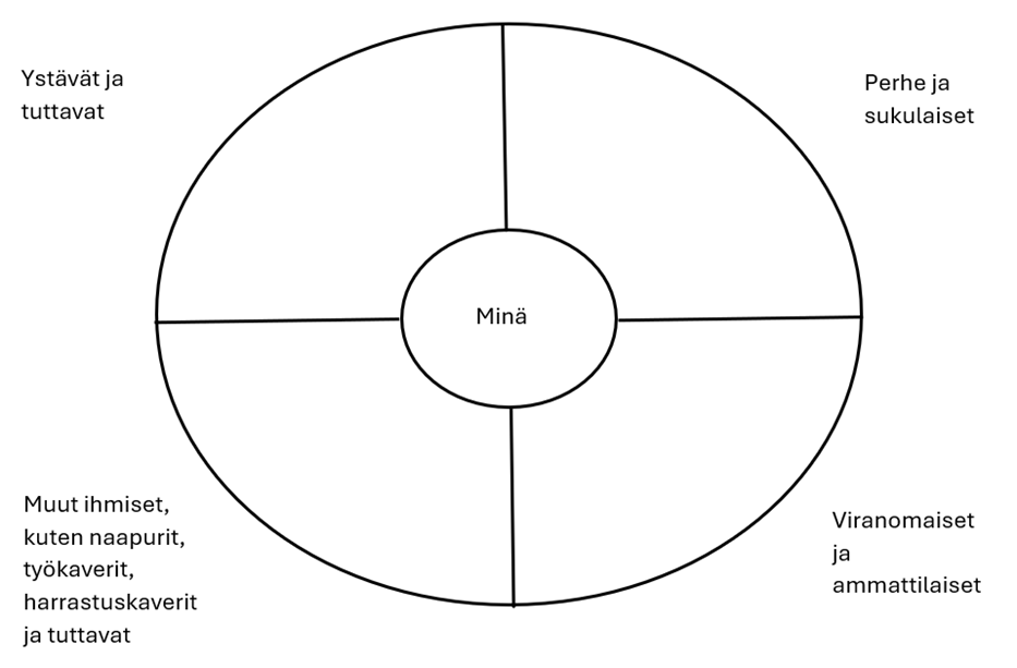 Tämän harjoituksen avulla voit kartoittaa omaa lähi- ja tukiverkostoasi. Harjoitus auttaa sinua oivaltamaan, kuinka paljon eri ihmisiä elämääsi tavalla tai toisella kuuluu. Joskus avun pyytäminen voi tuntua hankalalta, mutta yleensä se kannattaa. Useimmiten ihmiset auttavat mielellään.