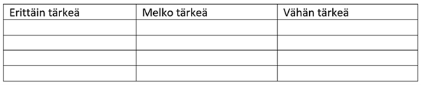 Lajittele listassa olevia arvoja kirjaamalla niitä taulukkoon eri sarakkeisiin sen perusteella, miten tärkeäksi koet kyseisen arvon. Tee rauhassa omat valintasi. Kaikkia arvoja ei tarvitse saada sovitettua taulukkoon. Voit myös itse keksiä arvoja ja listata niitä otsikoiden alle sarakkeisiin.